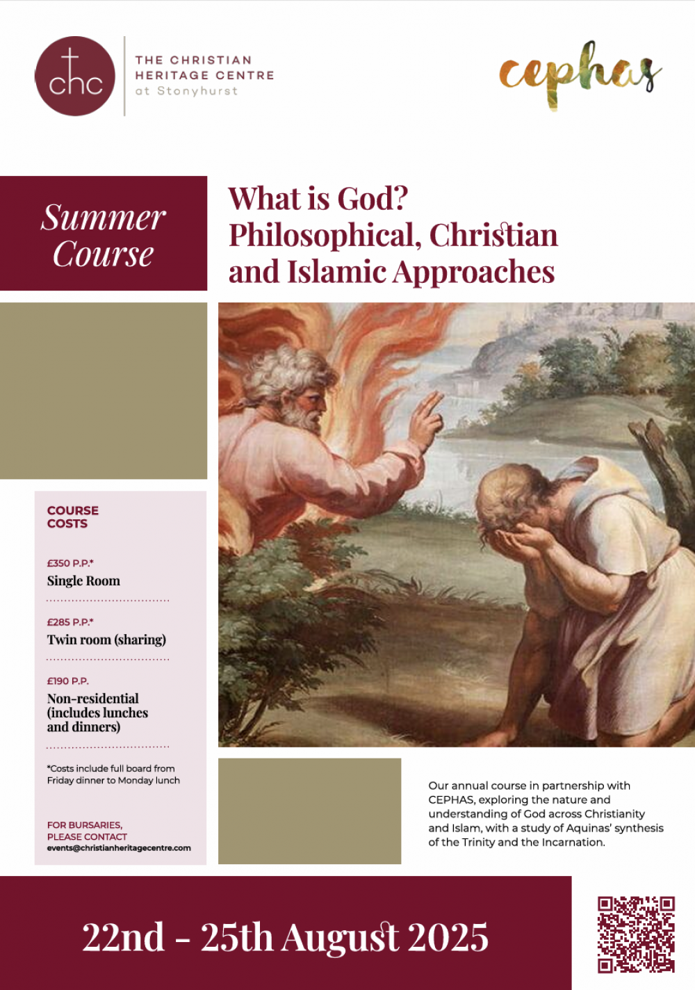 CEPHAS 2025 is delighted to partner again with the Christian Heritage Centre at Stonyhurst, for their annual course which this year will explore the nature and understanding of God across Christianity and Islam, with a study of Aquinas’ synthesis of the Trinity and the Incarnation. Participants will stay in the new dedicated retreat centre Theodore House, in the tranquil and beautiful surroundings of the Stonyhurst estate.