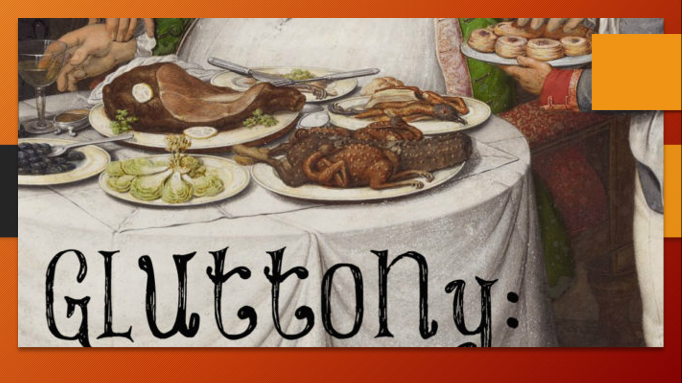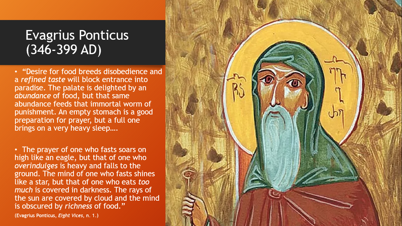 Tonight we will discuss the capital vice of gluttony. And I would like to begin with a few words from [SLIDE 2] “Evagrius Ponticus (c.346-399) in what is today modern-day Turkey. In order to deal with his personal sin, Evagrius retreated to the Egyptian desert and joined a cenobitic community of Desert Fathers. In AD 375, Evagrius developed a comprehensive list of eight evil “thoughts” (λογισμοι; logísmoi), or eight terrible temptations, from which all sinful behaviour springs.[1]