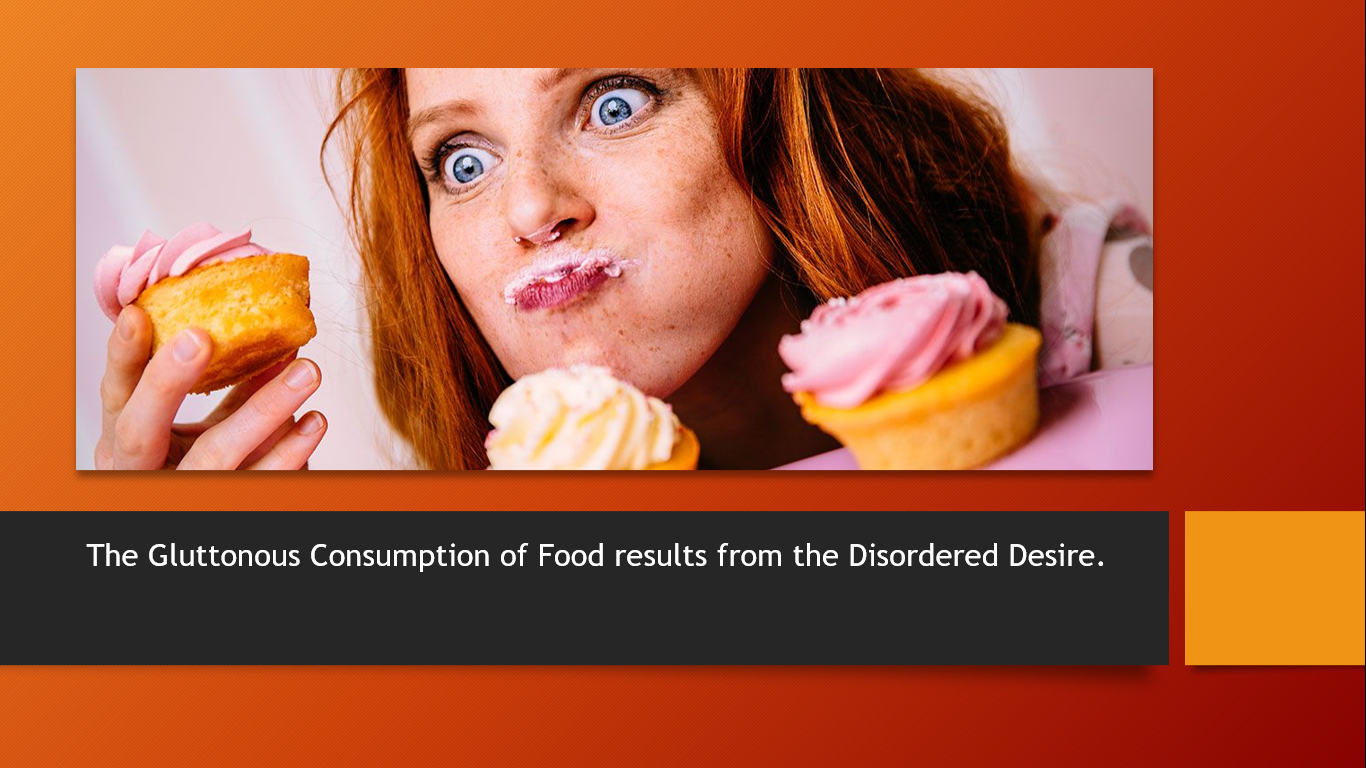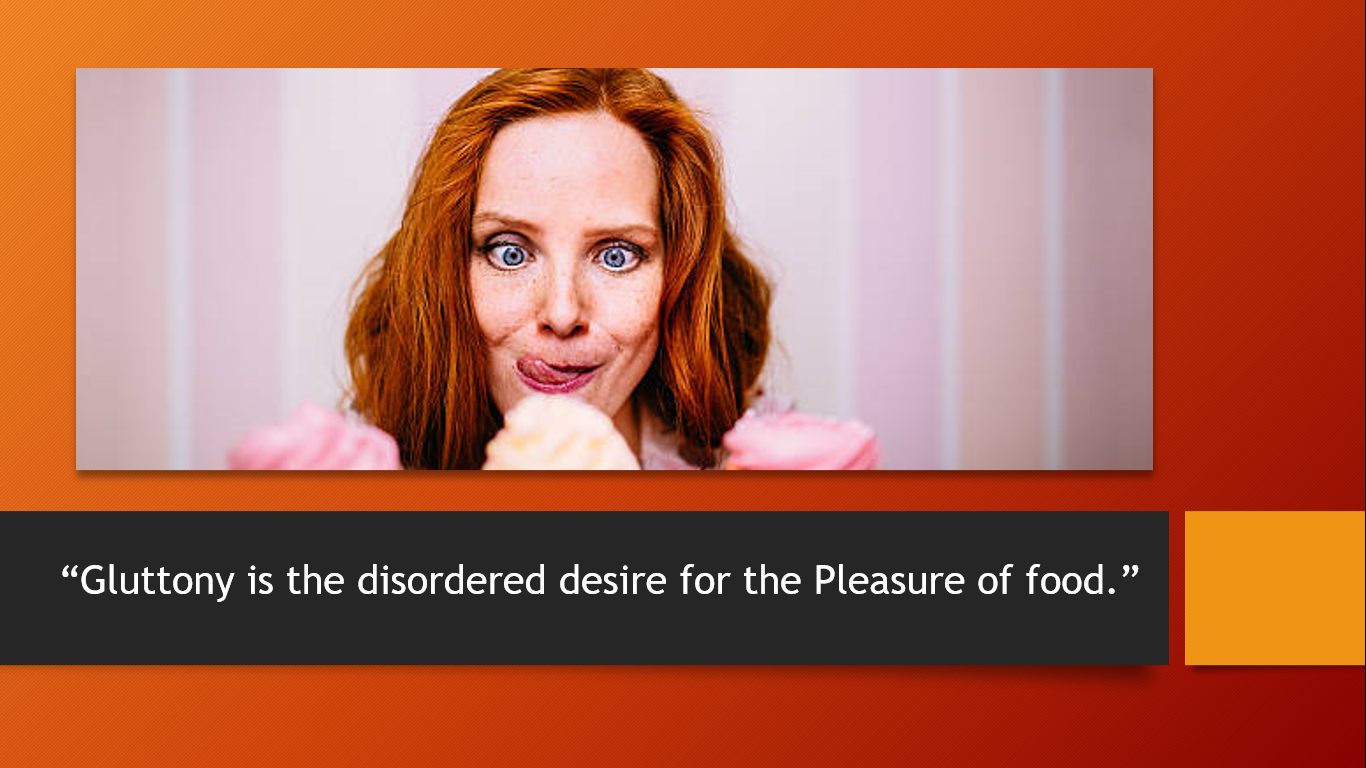 What happens with gluttony is that we begin to focus our minds on food, especially images of food, and arouse in ourselves a passion, or disordered desire for food that can begin then to control our thoughts, words, and actions.