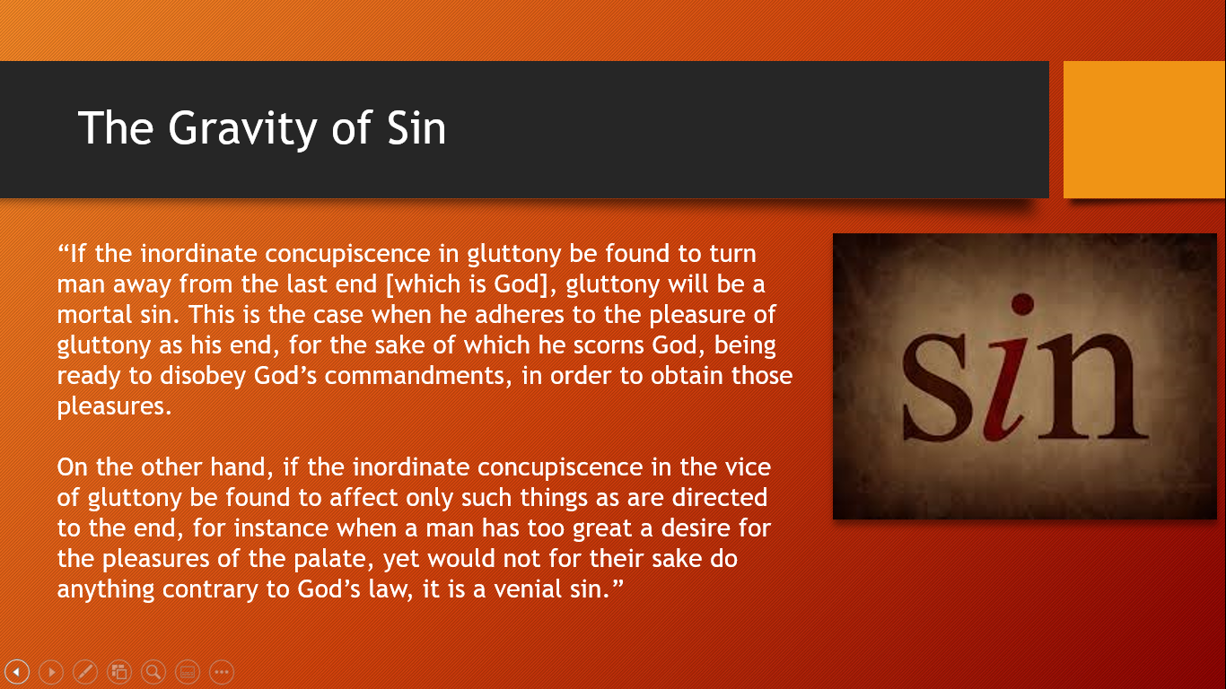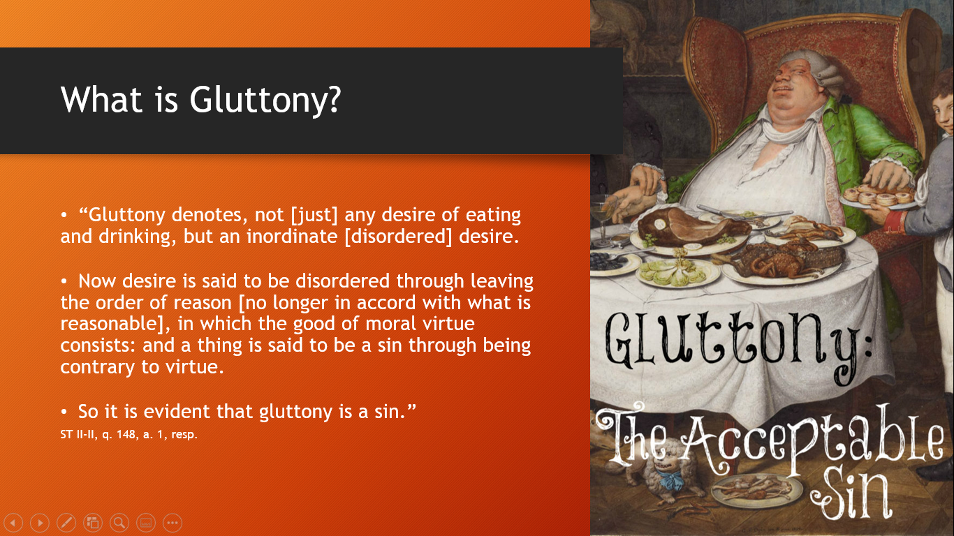 So “gluttony is a disordered desire for the pleasure of food.”[12] Aquinas explains that “of all the passions, the most difficult for reason to regulate is pleasure, and especially the natural pleasures that are "integral parts of our life," such as the pleasures in food and drink, without which we cannot live a human life. And so there is often a departure from the rule of reason regarding such pleasures. Therefore, there is the sin of gluttony when the desire for such pleasures goes beyond the rule of reason. And so there is the saying that "gluttony is the disordered desire to eat."