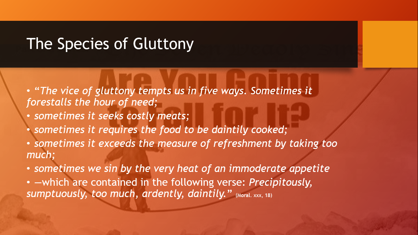 Now the vice of gluttony is not simply about eating too much. St. Gregory the Great lists the different species, or kinds, of gluttony. He says that “ (Moral. xxx, 18): The vice of gluttony tempts us in five ways. Sometimes it forestalls the hour of need; sometimes it seeks costly meats; sometimes it requires the food to be daintily cooked; sometimes it exceeds the measure of refreshment by taking too much; sometimes we sin by the very heat of an immoderate appetite—which are contained in the following verse: precipitously [too soon], sumptuously, too much, ardently, daintily.”[16]