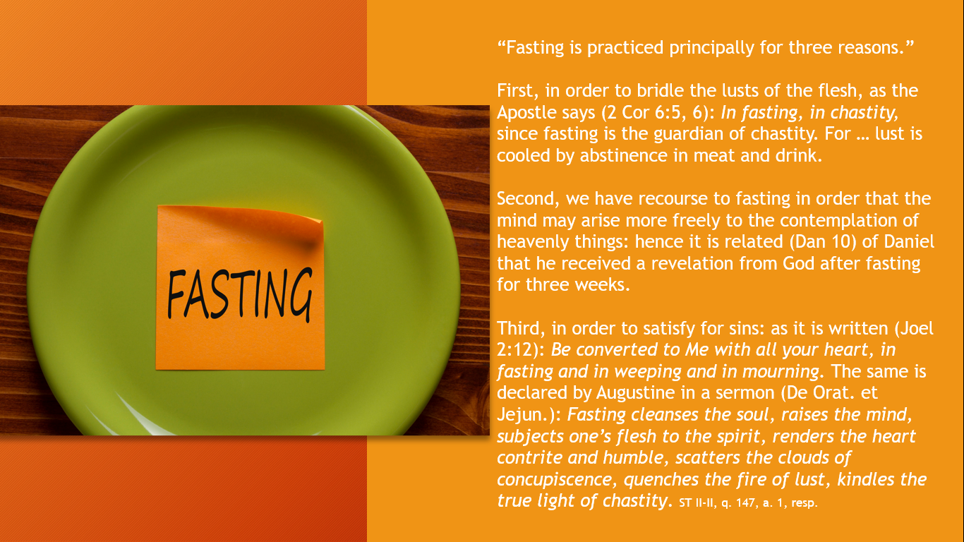 And as I mentioned, according to St. Thomas, fasting is an act of the virtue of abstinence. He explains that “fasting is practiced principally for three reasons.”