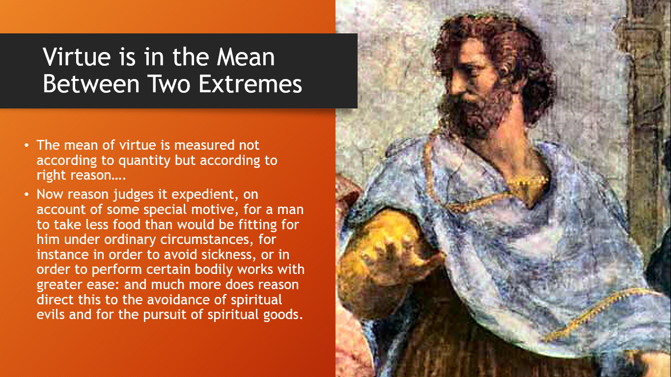 Aquinas, following Aristotle, explains that the virtue is in the mean, or the middle ground, between two extremes, that is between excess on the one hand, and defect, on the other. He explains,