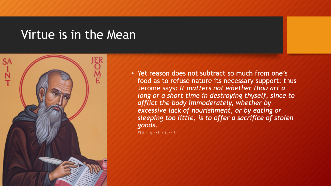 The mean of virtue is measured not according to quantity but according to right reason…. Now reason judges it expedient, on account of some special motive, for a man to take less food than would be fitting for him under ordinary circumstances, for instance in order to avoid sickness, or in order to perform certain bodily works with greater ease: and much more does reason direct this to the avoidance of spiritual evils and for the pursuit of spiritual goods.