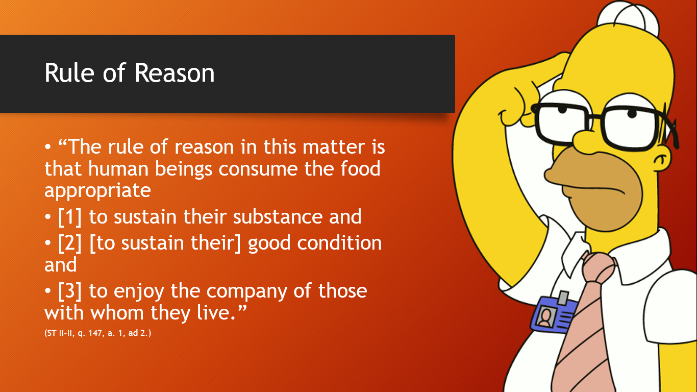 So the right reason of abstinence or fasting is found between the excessive intake of food, on the one hand, and the defect of eating too little, in a way that would be harmful to one’s health or prevent one from carrying out one’s daily tasks, on the other hand. This is what St. Thomas calls the “rule of reason” with respect to food. He explains that “The rule of reason in this matter is that human beings consume the food appropriate [1] to sustain their substance [life] and [2] good condition [health] and [3] to enjoy the company of those with whom they live…. Therefore, when human beings desire and consume food according to this rule of reason, they consume food according to their need. And when they exceed this limit, they go beyond the rule of reason and depart from the virtuous mean in order to satisfy their appetite for pleasure.”[26]