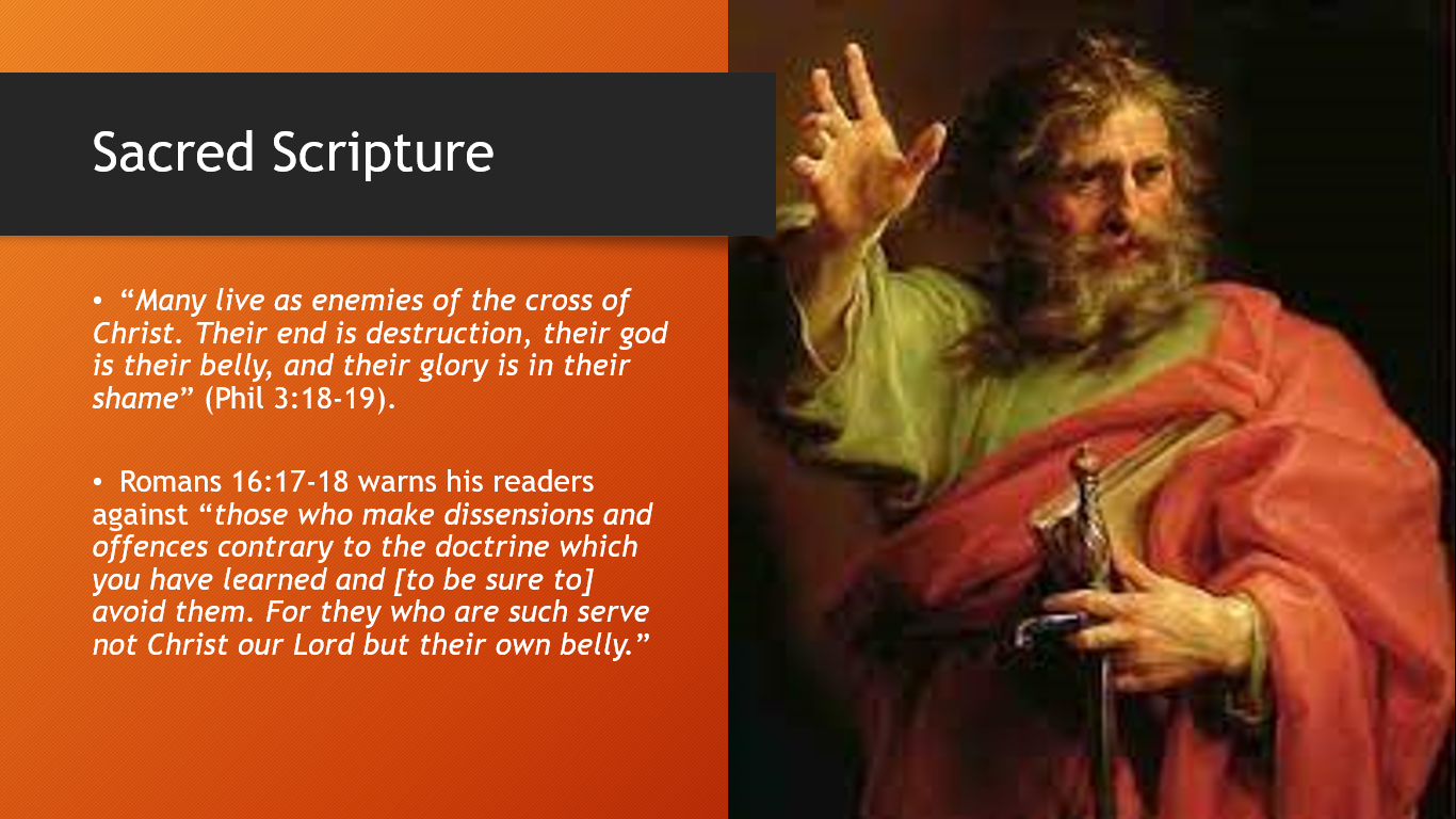If we turn now to Sacred Scripture, we see that gluttony, as well as other vices, can also lead to a certain kind of idolatry. St. Paul warns the Philippians, “Many live as enemies of the cross of Christ. 19Their end is destruction, their god is their belly, and their glory is in their shame” (Phil 3:19). And in his letter to the Romans (16:17-18), he also warns his readers against “those who make dissensions and offences contrary to the doctrine which you have learned and [to be sure to] avoid them. For they who are such serve not Christ our Lord but their own belly.” In other words, as St. Thomas Aquinas explains, “They preached not for the glory of Christ but for revenue, in order to fill their belly.”[3]