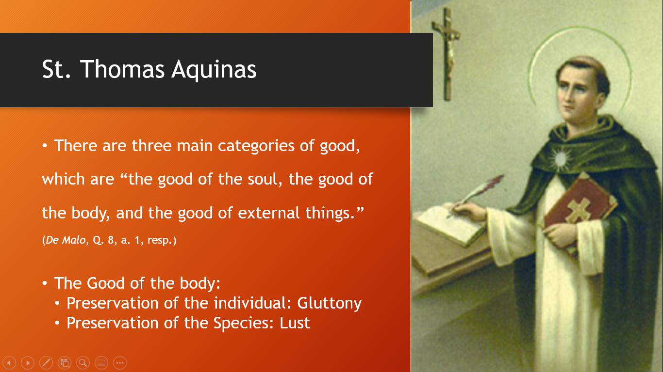 Now in order to understand better what gluttony is, we need to see first what type of good we are purportedly seeking when we fall into gluttony. Aquinas explains that there are three main categories of good, which are “the good of the soul, the good of the body, and the good of external things.”[5] What he calls the Capital Vices, which we are here referring to as the evil thoughts, are distinguished according to a disordered movement toward or away from these goods. The good of the body can be subdivided according to the preservation of the individual and the preservation of the species. With regard to the good of the body in the form of the preservation of the individual (i.e, with regard to food or drink), we find that this good is pursued inordinately [in a disordered way] by gluttony, whereas in the form of the preservation of the species (by way of sexual intercourse), it is sought in a disordered way by the vice of lust.
