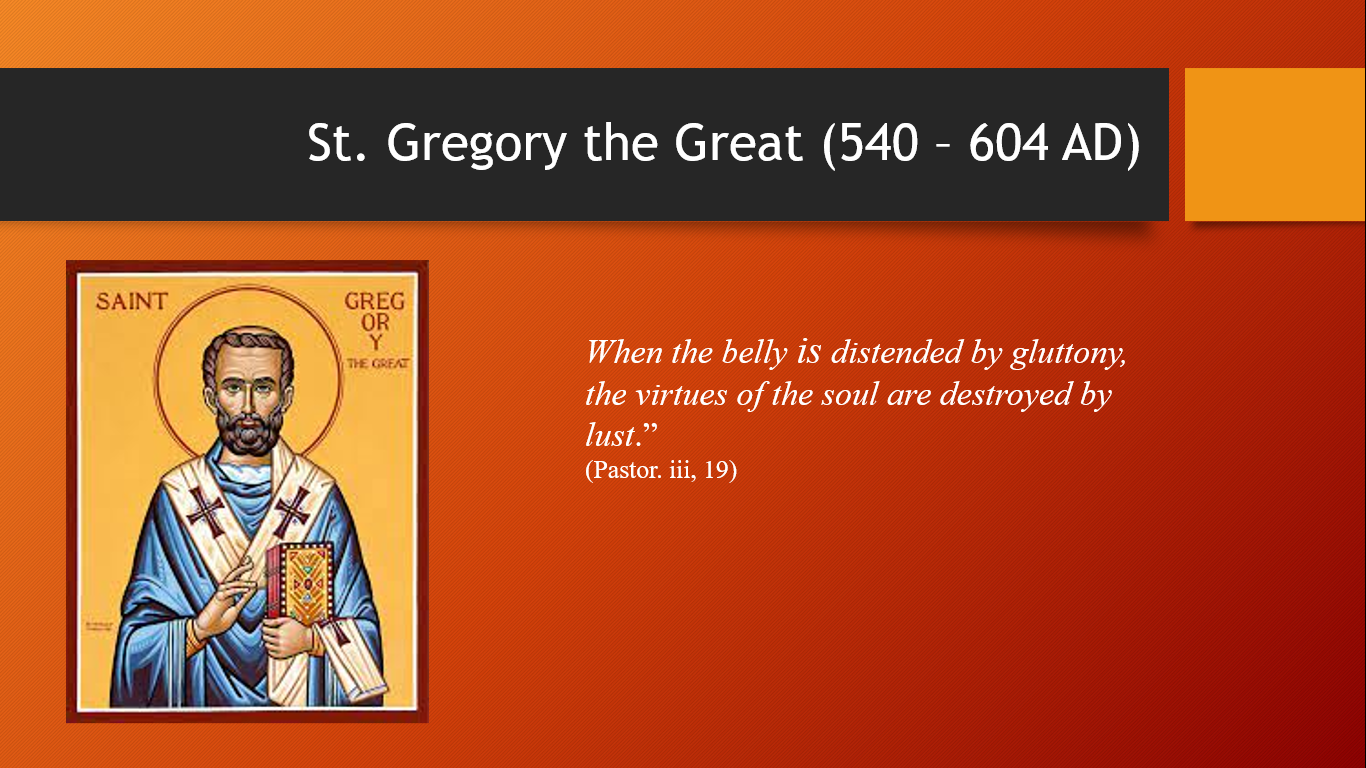 And St. Gregory the Great, Pope from 590-604, also teaches that “(Pastor. iii, 19): When the belly is distended by gluttony, the virtues of the soul are destroyed by lust.”[8]”