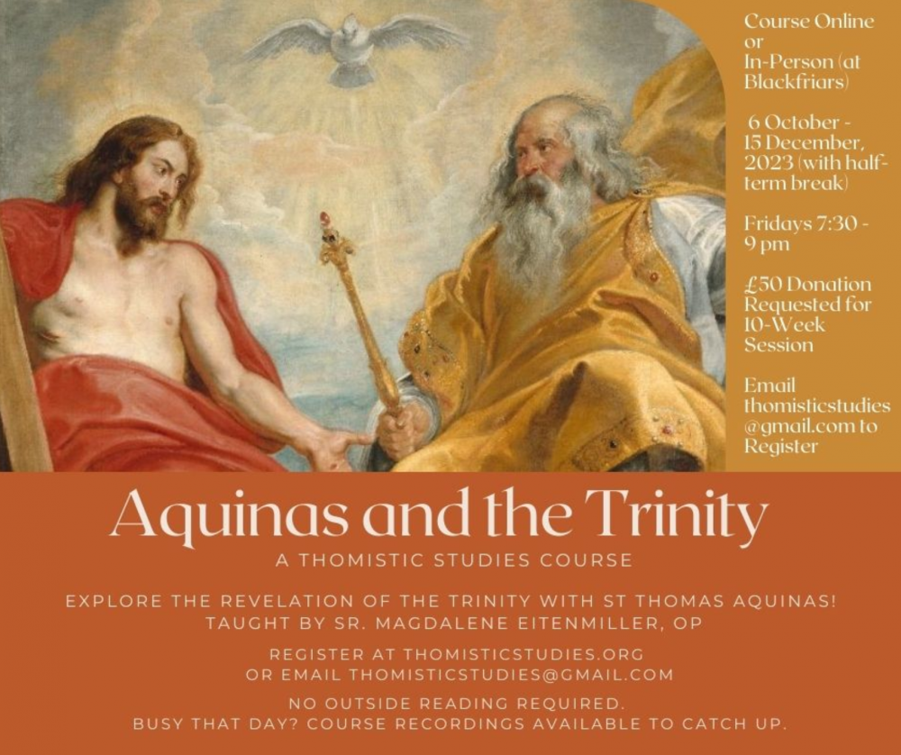 Just wanted to let you know that one of our sisters will be teaching a 10-week course on Aquinas and the Trinity to run Friday evenings 7:30-9 pm, from 6 October - 15 December (with half-term break in November). It will be held both in-person (Cambridge) and online via Zoom. The requested donation for the Dominican Sisters is £50 for the entire course. For more information or to register, go to the Thomistic Studies website: https://www.thomisticstudies.org You can register online or by emailing This email address is being protected from spambots. You need JavaScript enabled to view it. Please also pass this on!